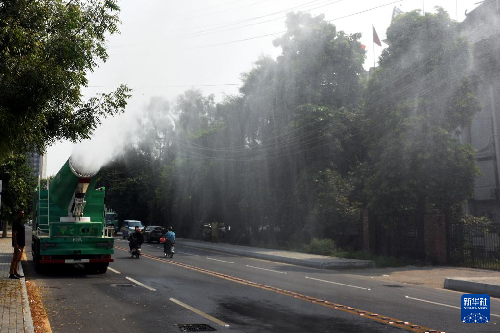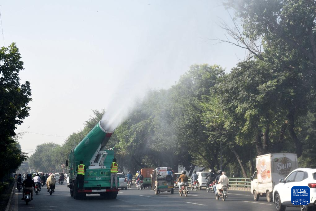 10月23日,在巴基斯坦拉合爾,巴基斯坦環(huán)境保護(hù)局的霧炮車(chē)在街頭工作,以遏制空氣污染。